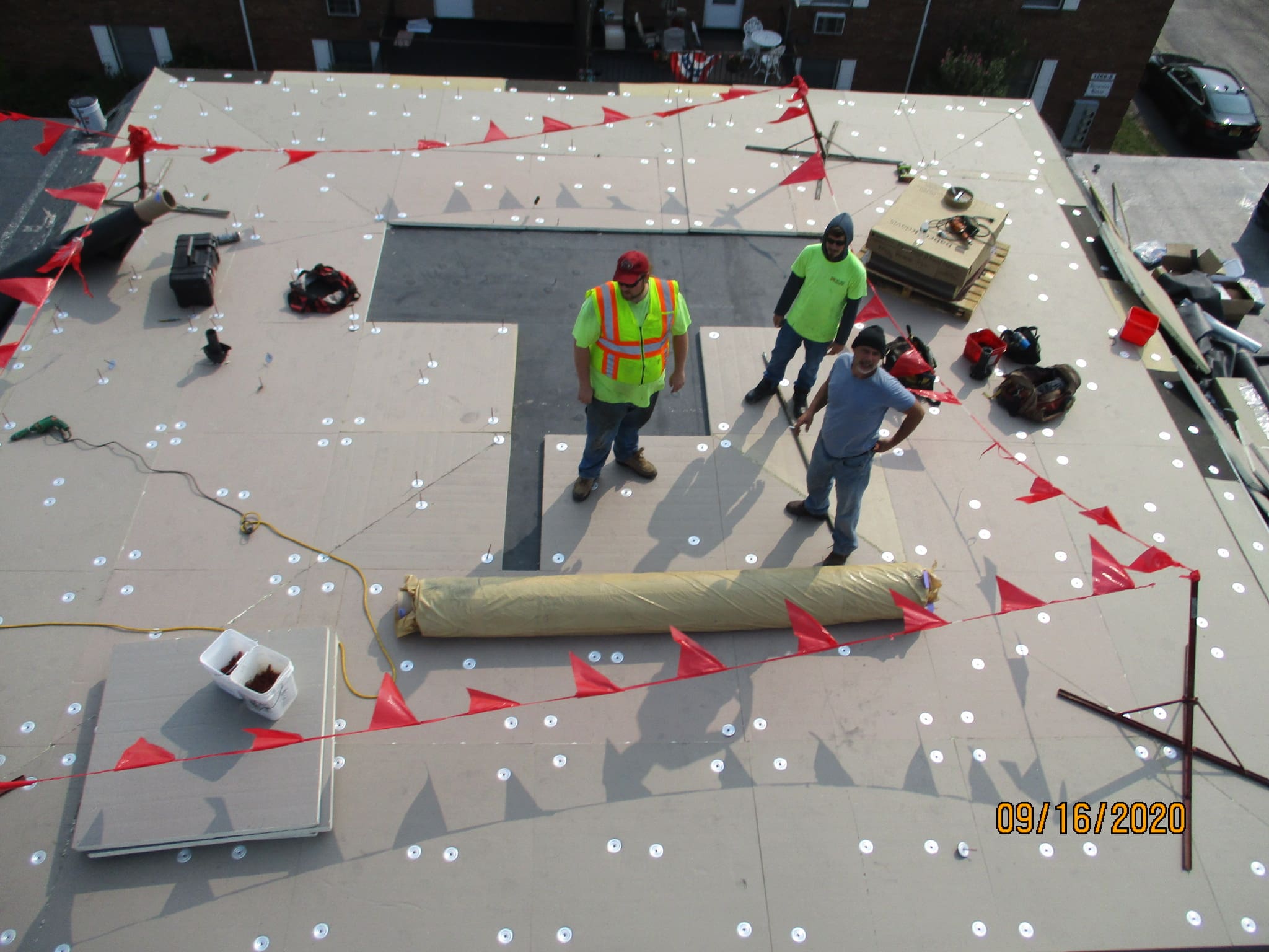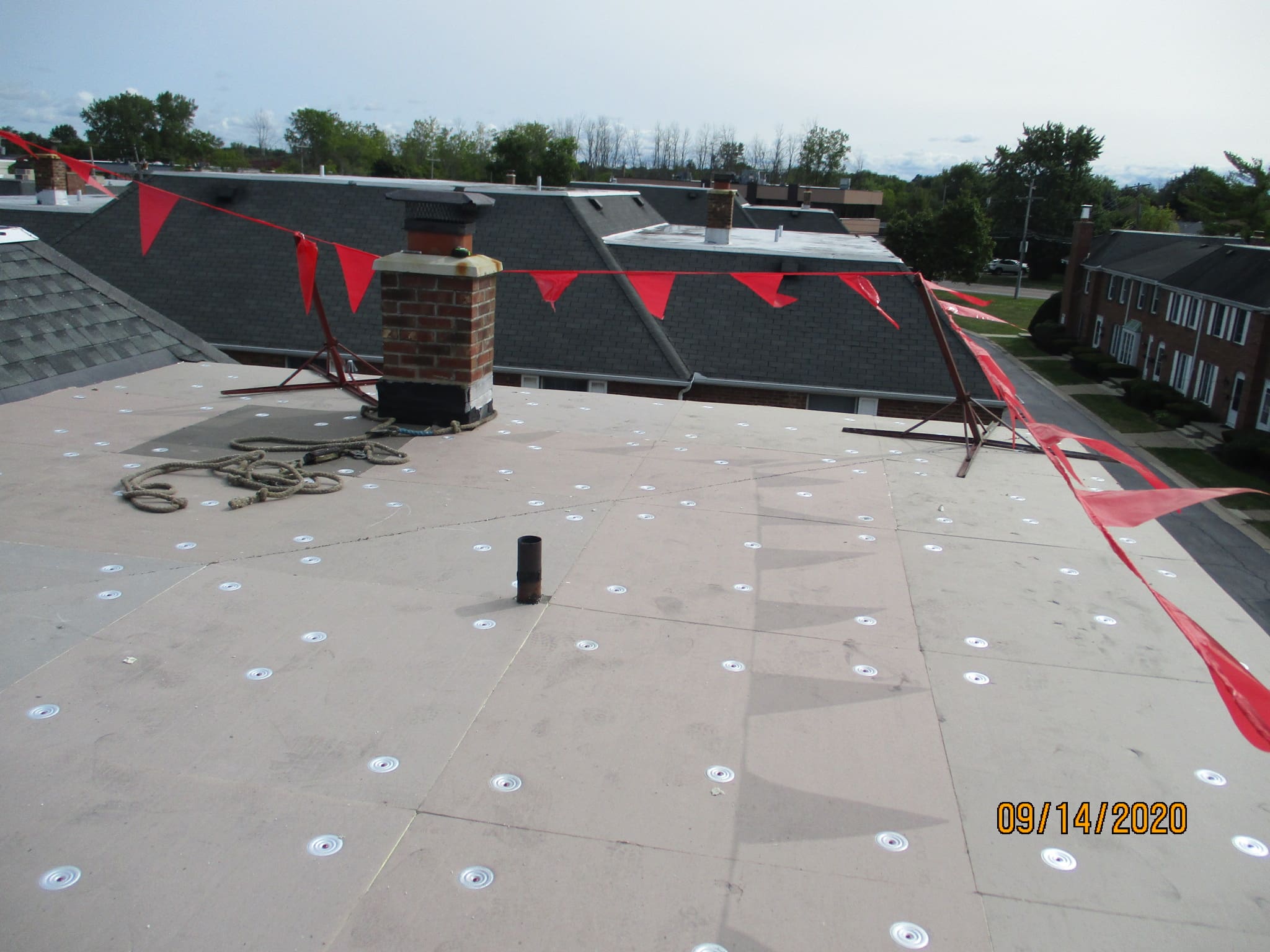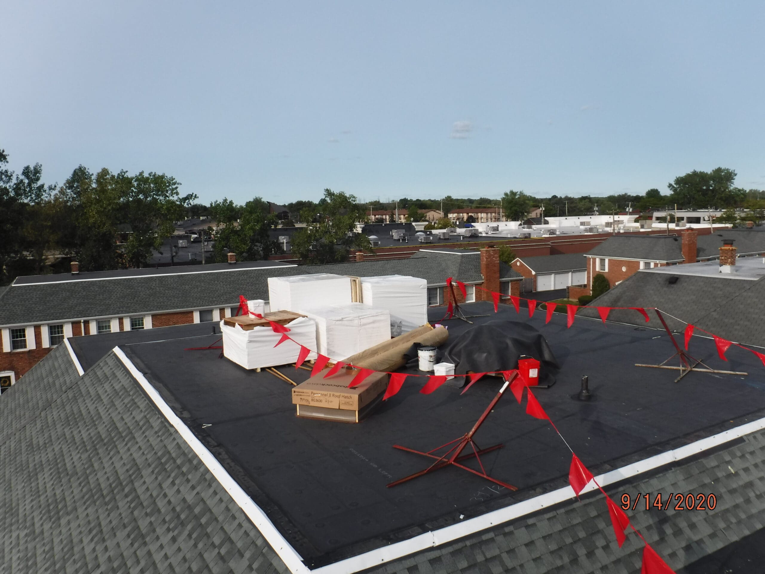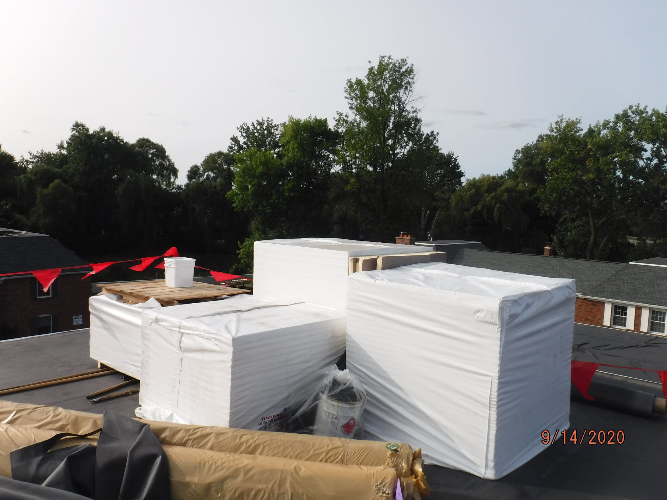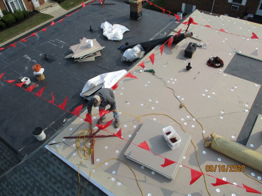 Recover over existing EPDM roof with an Elevate taper system of insulation board as to direct water off of the roof and down to the gutters.
