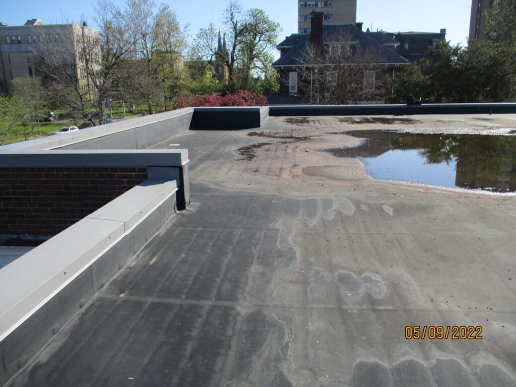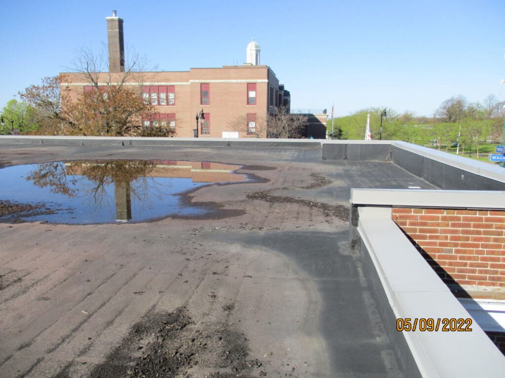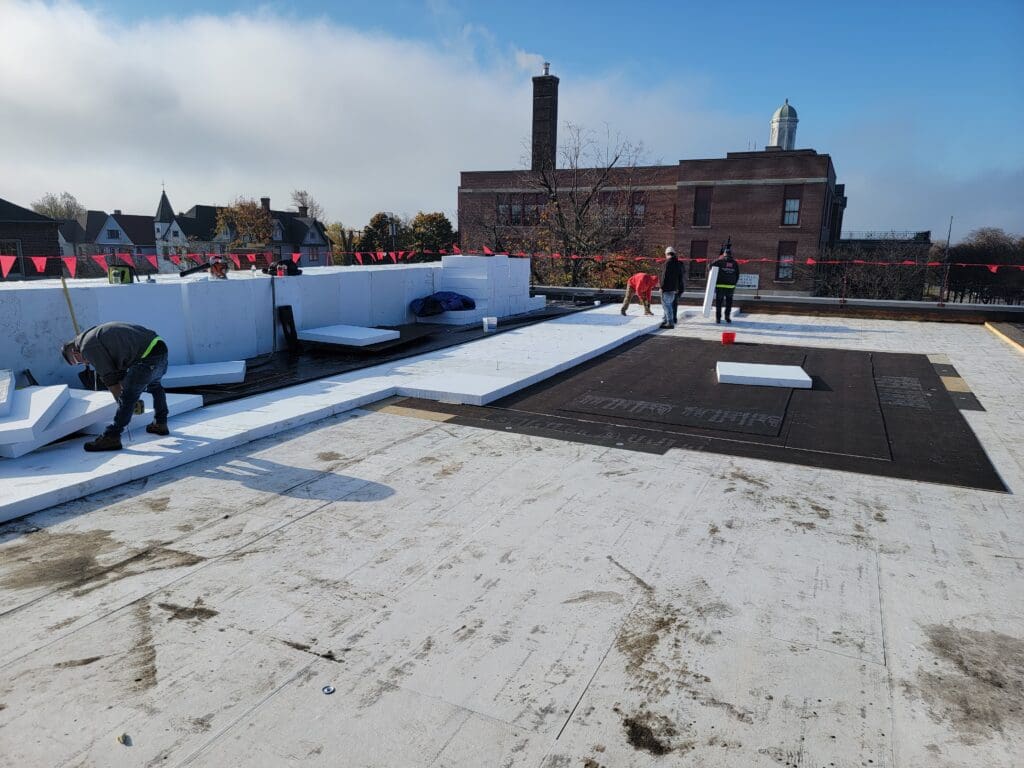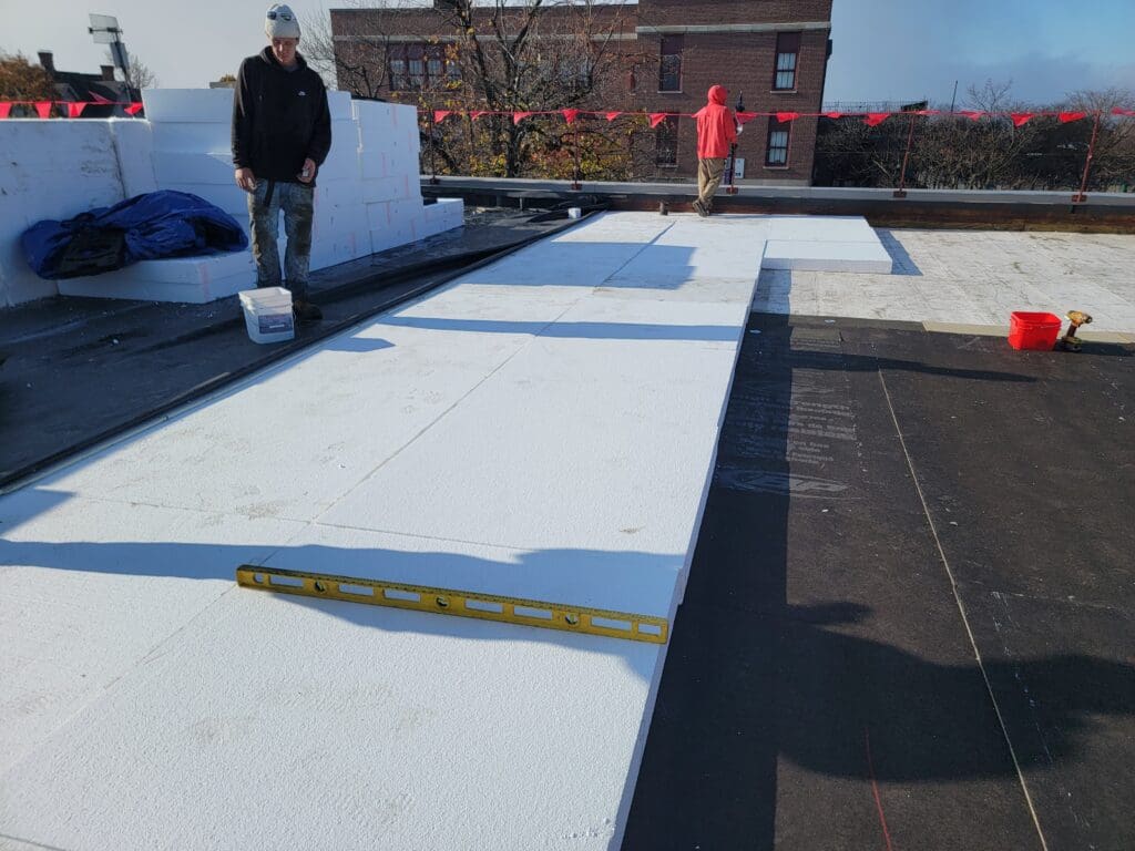 Installed a 0.5″ to 10″ EPS foam taper system on the entirety of the roof to direct drainage to back wall drain.